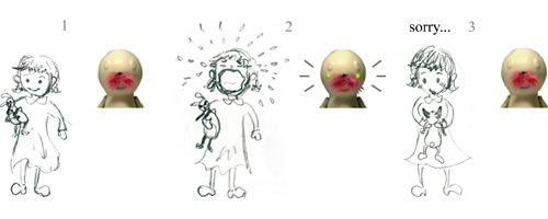 Mr.Smilit reacts to a child's crying noise & it starts crying too. As a result, this child feels too sorry to cry any more, which stops him/her crying.