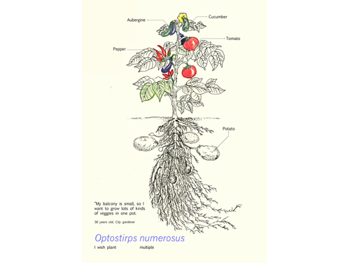 Optostirps is a project working with established gardeners. It offers the chance to open up discussions on the potential futures of gardening and plants by asking gardeners to imagine what sorts of wishes could be expressed by plants. Optostirps plays on the classification conventions of plants in the Western world whereby all known plants have two Latin names. The radish is, for example, Raphanus sativus. Raphanus is the plant’s genus name and sativus is its species name. Optostirps, or “I wish plant”, is the genus name for this collection of future plants. Each plant also has a corresponding species name that reflects the issues raised by the gardener consulted.